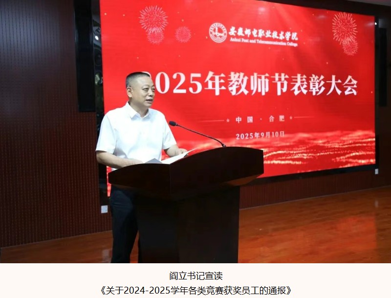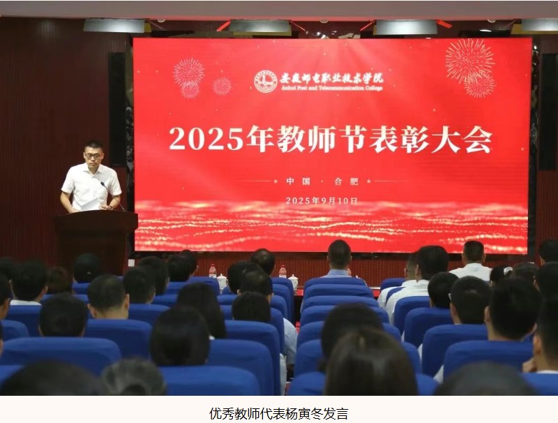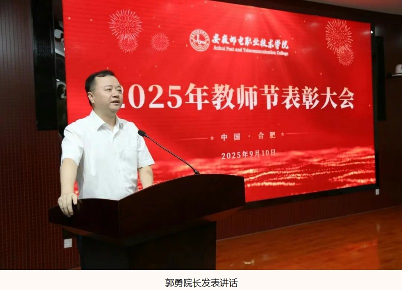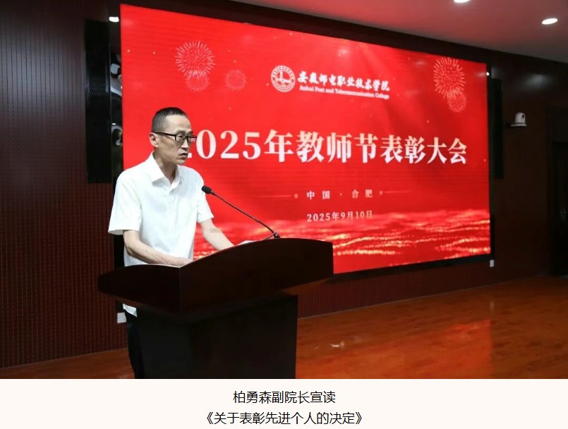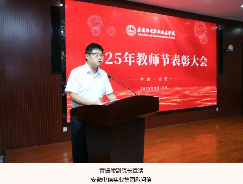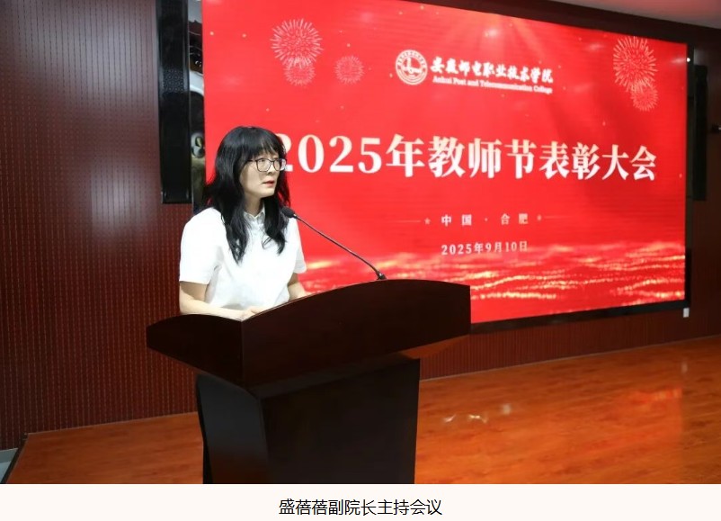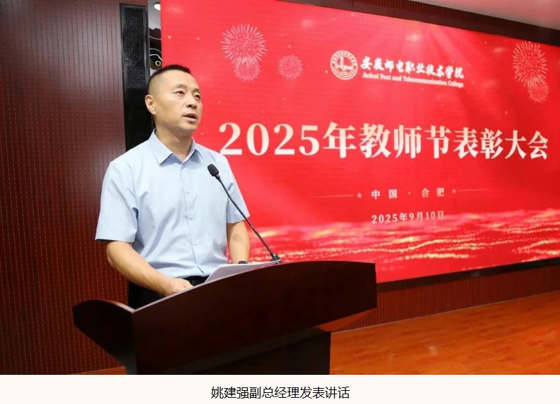 9月10日,安徽邮电职业技术学院举行2025年教师节庆祝暨表彰大会。安徽电信实业集团有限公司副总经理姚建强莅临大会,学院管理层、2024年度受表彰的先进个人和教职工出席大会。会议由学院副院长盛蓓蓓主持。