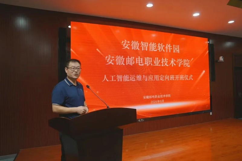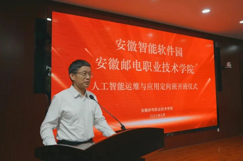 9月11日,安徽邮电职业技术学院与安徽智能软件园联合打造的人工智能运维与应用定向班正式开班, 安徽智软数字科技有限公司董事长兼总经理、合肥市软件与人工智能行业协会秘书长陈方友,合肥善达信息科技有限公司董事长肖波,合肥青谷信息科技有限公司副总经理刘毅,安徽邮电职业技术学院院长郭勇、相关部门负责人以及定向班老师和全体学生共同出席了此次仪式。仪式由学院计算机与网络学院院长王飞主持。